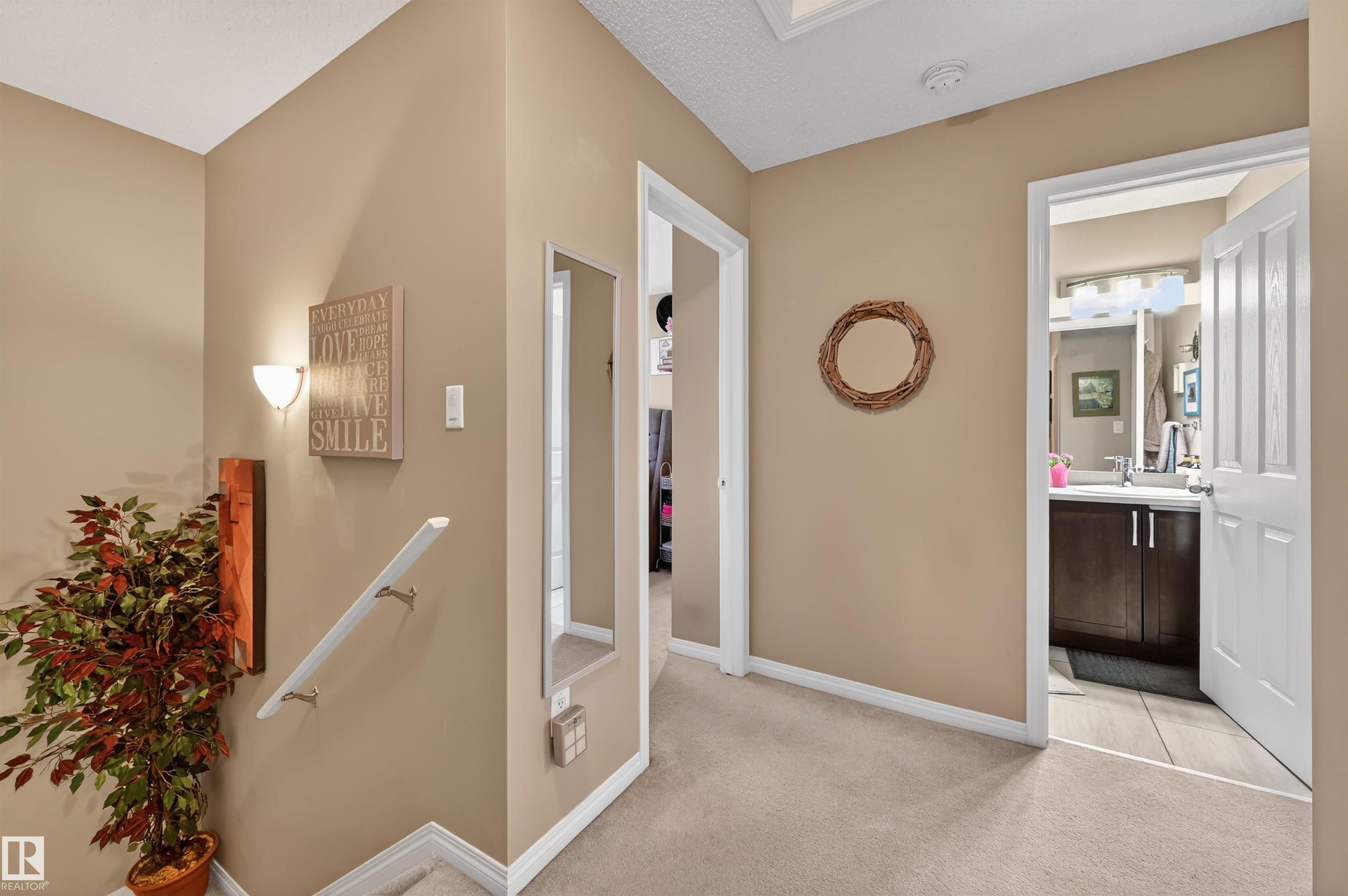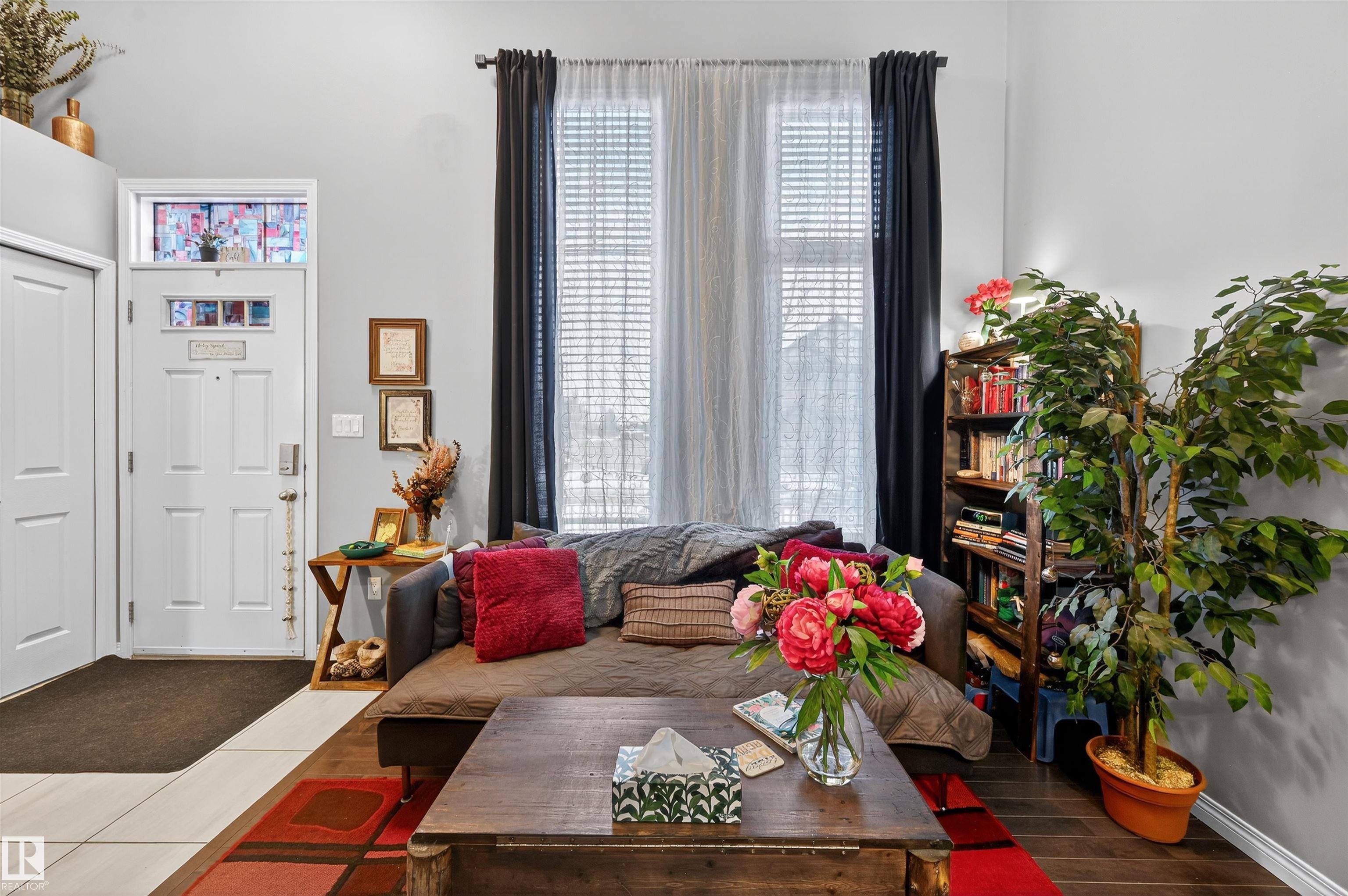 This beautifully maintained 3 bed, 1.5 bath- 1,245 sq ft townhome with double attached garage stands out for its exceptional positioning and thoughtful upgrades. Facing open green space (not another row of homes), enjoy stunning sunrises and sunsets through oversized windows that flood the home with natural light. The front yard is upgraded with turf and tile for low-maintenance living, and the private rear balcony offers the perfect spot for morning coffee or evening unwinding.There is a dedicated office/library space, built-in shelving, California Closets throughout Upgrades include: granite countertops, breakfast bar, sunken living room, hardwood floors and 3 ceiling fans The rear layout offers comfortable seperation from neighbouring units, and the adjacent neighbours on both sides are known to be quiet, respectful, and responsible ? a wonderful bonus for peaceful day-to-day living. Just steps from a park and a gazebo, and blocks from the vibrant Social House ? offering year round events.