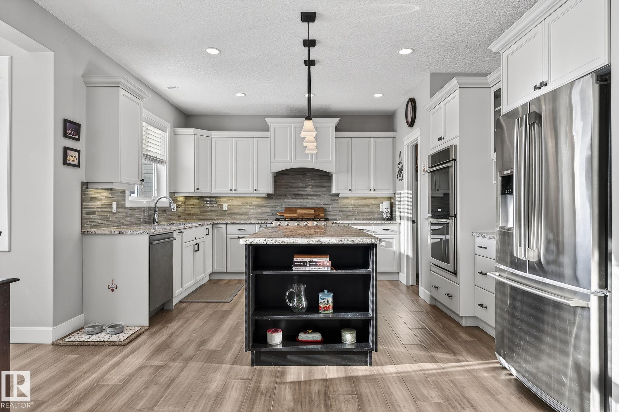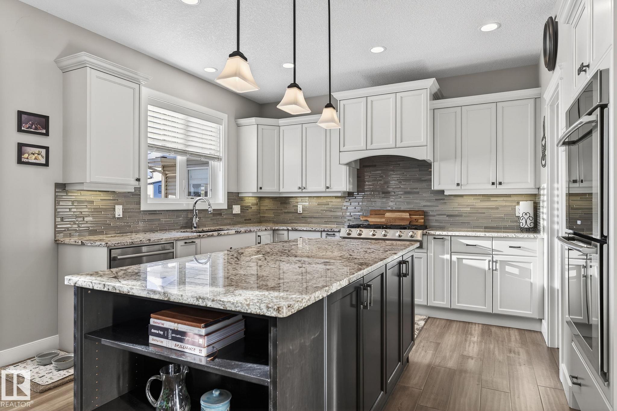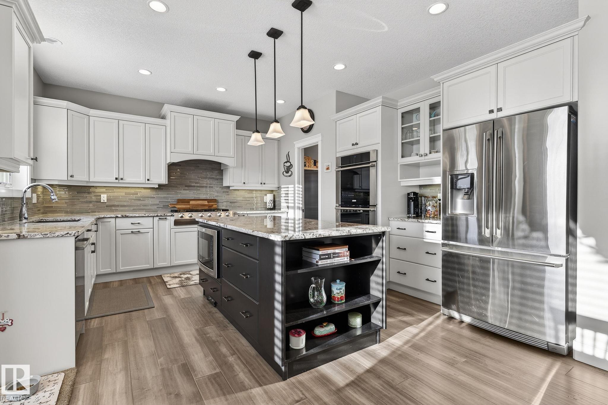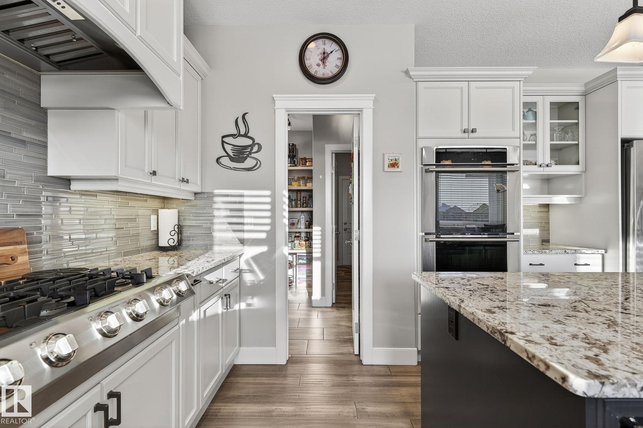 Tucked into a highly sought-after neighbourhood on a quiet cul-de-sac, this custom-built walkout home immediately stands apart for its craftsmanship and setting. Backing onto a tranquil pond and walking trails, the professionally landscaped yard with underground sprinklers is complemented by covered upper and lower decks designed for year-round enjoyment. The main floor boasts newer engineered hardwood flooring, a bright open layout with a dedicated office, inviting entertainment space, and a chef-inspired kitchen featuring a large island, gas cooktop, and two built-in ovens. Upstairs, generous bedrooms with walk-in closets?each with built-in organizers?plus a thoughtfully designed laundry room, and an expansive primary retreat with dual sinks, freestanding tub, and oversized walk-in closet provide both function and style. The fully finished walkout basement extends the living space with an entertainment area, wet bar, gas fireplace, and additional bedroom?perfectly balancing comfort and lifestyle.